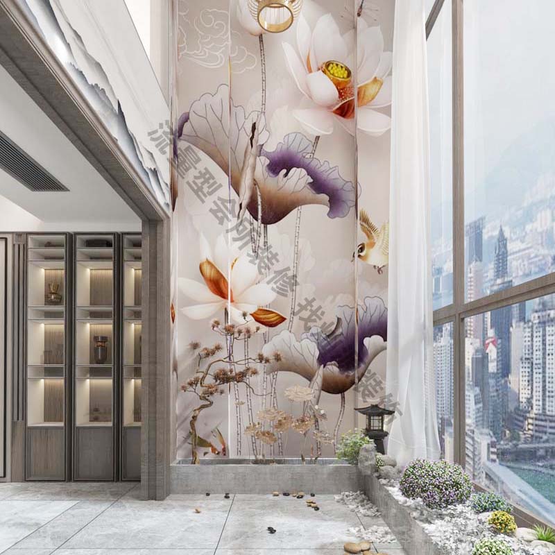 洽談區(qū)使用中式的推拉門隔斷隔開,主坐前方的中式柜不只具有美觀裝飾作用,更影響人們的視覺感知,結(jié)合陽臺的大型荷花手繪,中式建筑與自然地融合,無一不透露著舒適與愜意。
