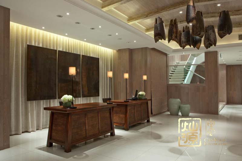 田元餐廳設計,南寧餐廳裝修要素二:接待區(qū)原木的座椅和木質(zhì)桌子搭配,給人一種樸實的味道。在搭配原木的柜子,使整個氛圍更濃郁。別具一格的吊燈,使空間充滿奢華感,將整個中式田元味道展現(xiàn)在人們面前。