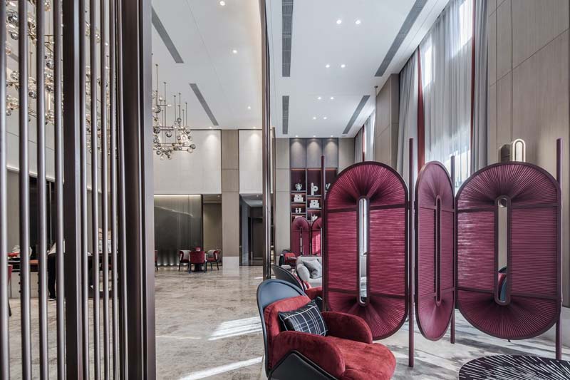 為了更好的提升整體檔次,為進(jìn)店業(yè)主營造更多的舒適感與信任感,從而起到銷售中的促進(jìn)作用。設(shè)計(jì)師將精致軟裝設(shè)計(jì)發(fā)揮到極致:自帶藝術(shù)造型感根雕、紅與黑的布藝靠背沙發(fā)、及頂木質(zhì)書架展示柜……帶來的不止有美觀的視覺效果,更能讓業(yè)主真切的感受到舒適自在的家庭氛圍,從而促進(jìn)購買決心。